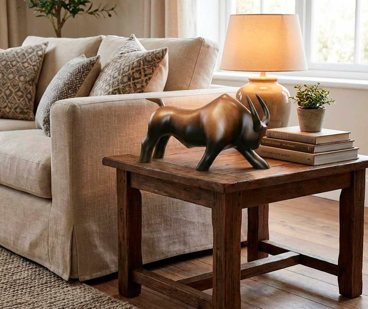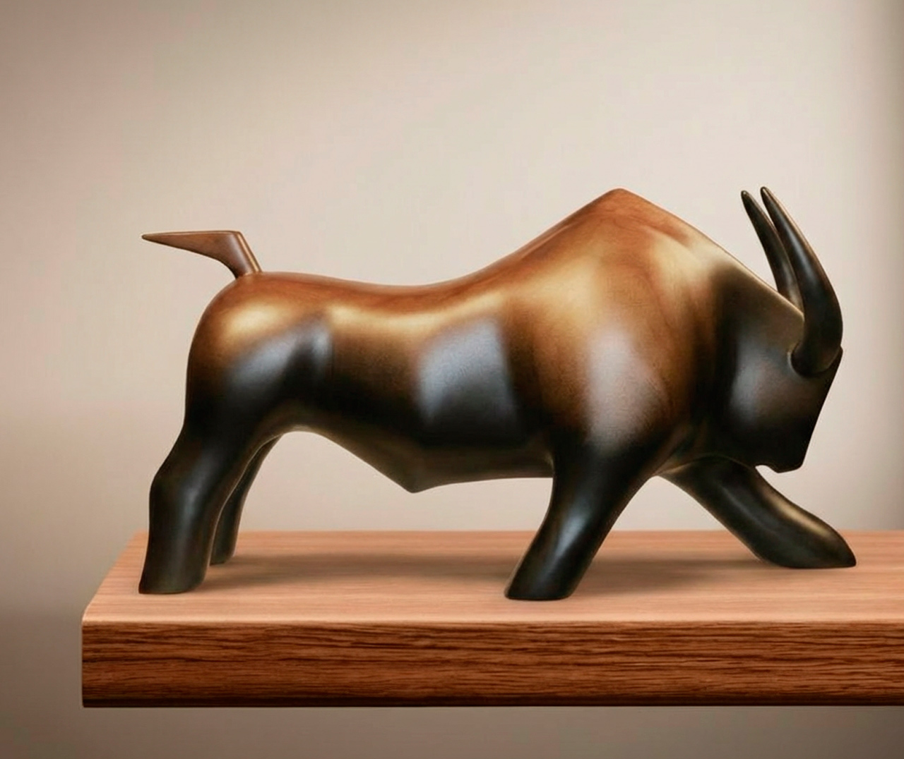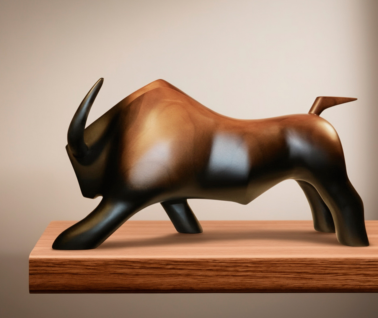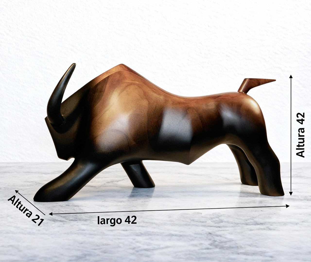 Escultura en madera que representa al toro. Animal respetado por su fuerza, objeto de masculinidad, energía y agresividad. De temperamento muy fuerte y que gusta de vivir de libertad. La desconfianza les agudiza el instinto.